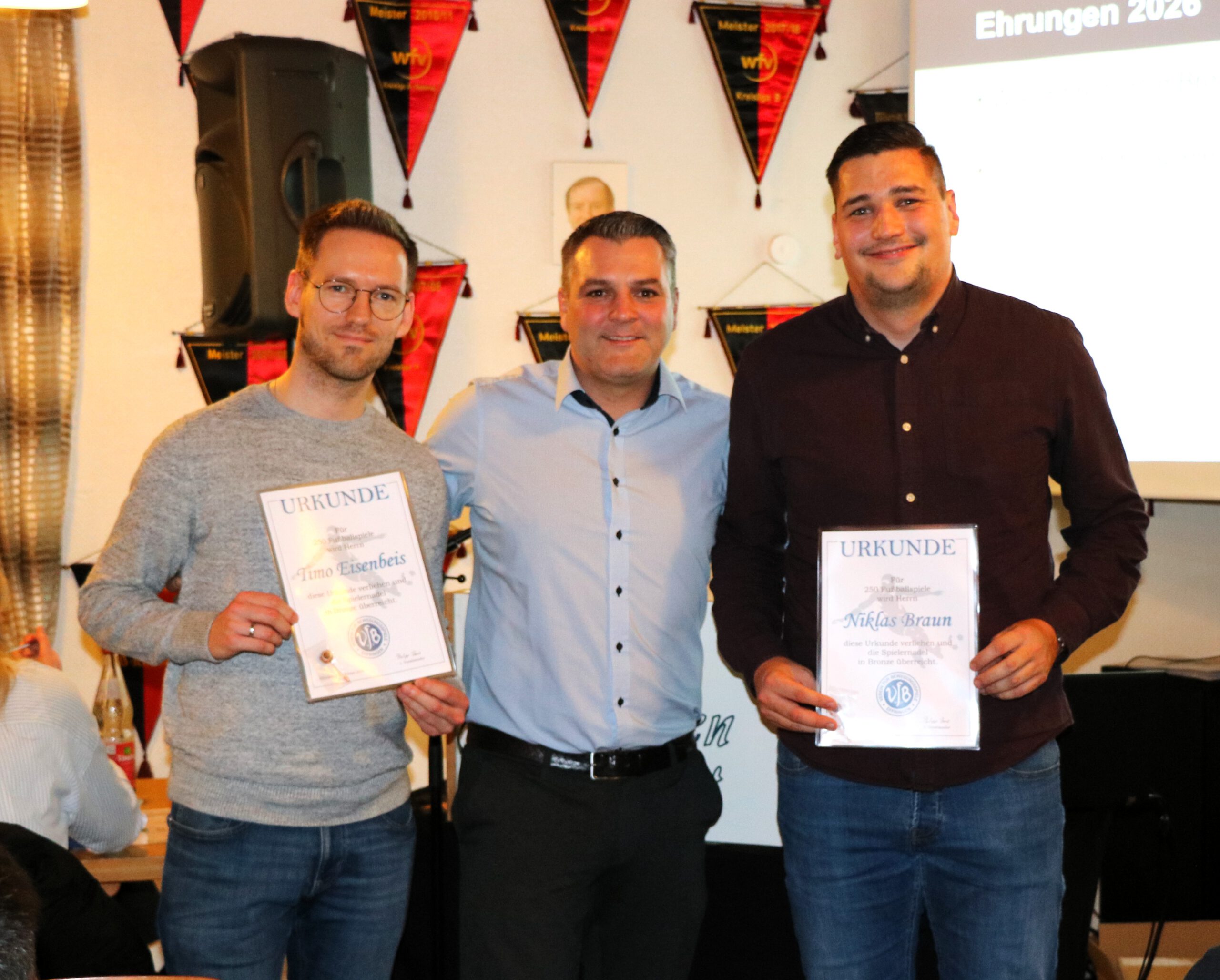 Die Spielernadel in Bronze für 250 Einsätze erhielten Timo Eisenbeis, Niklas Braun, Maurice Hasselmann und Daniel Kreudler.